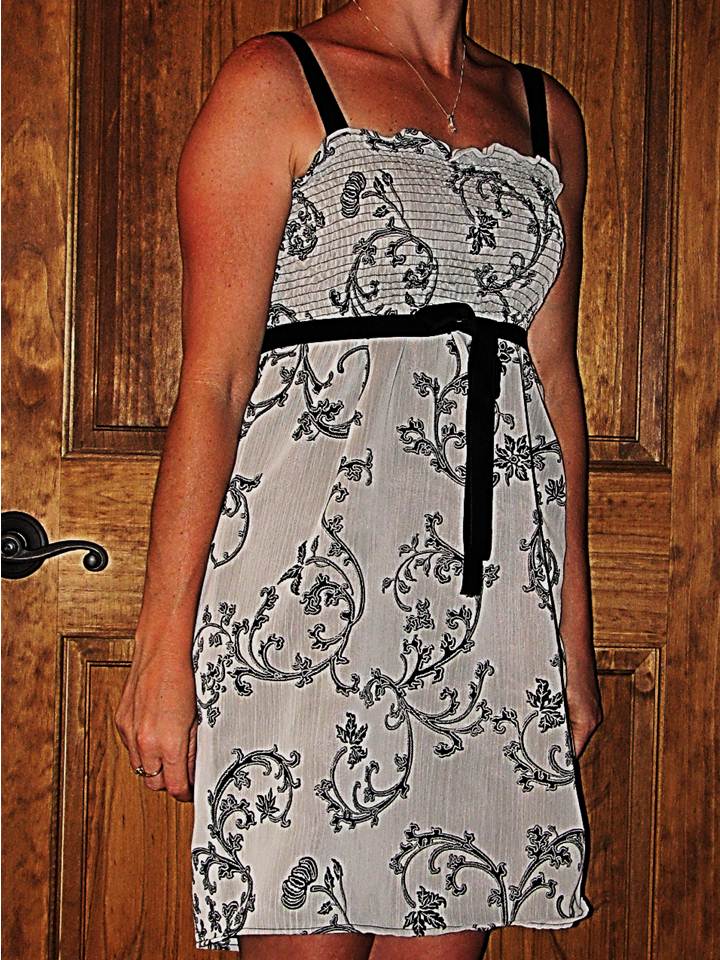 I love this style and many fabrics can be used. I used a shear white fabric with the beautiful black scroll work design and lined it with black non static lining fabric.